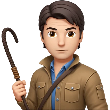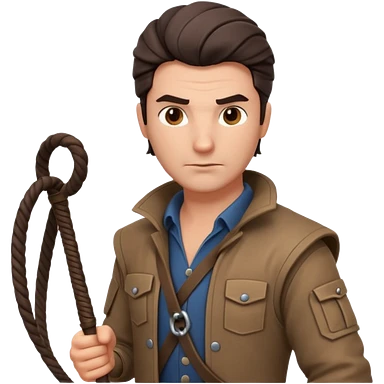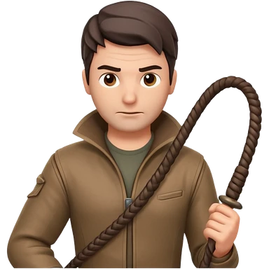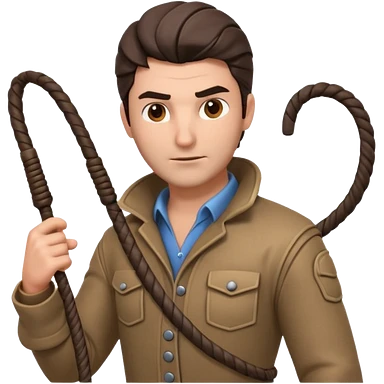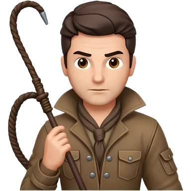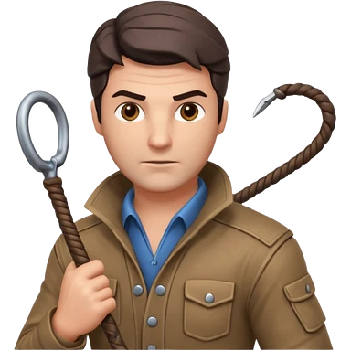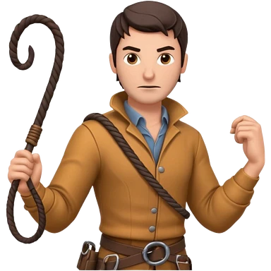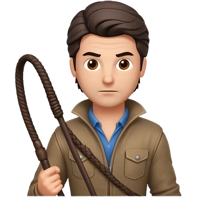 man with a whip portrait, head and shoulders only, whip coiled on shoulder, rugged outfit, confident look, 3D cartoon, mobile game icon style, clean background, no text, no watermark emoji