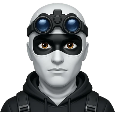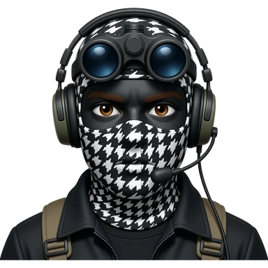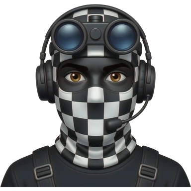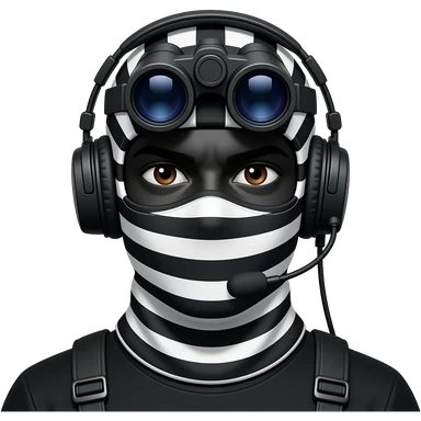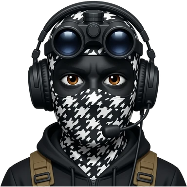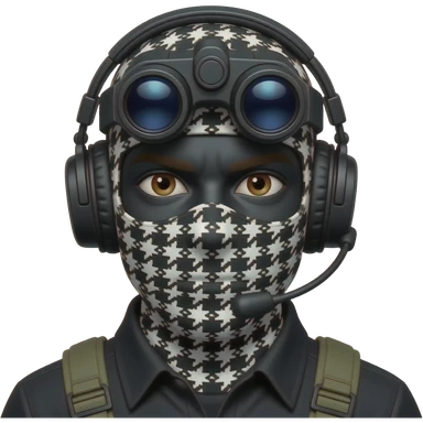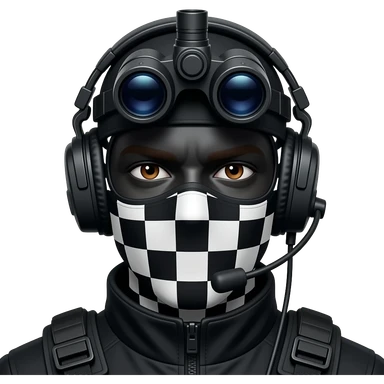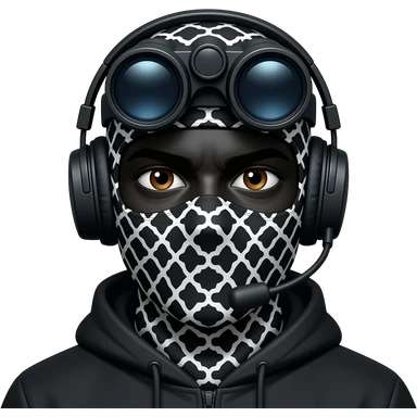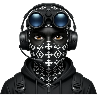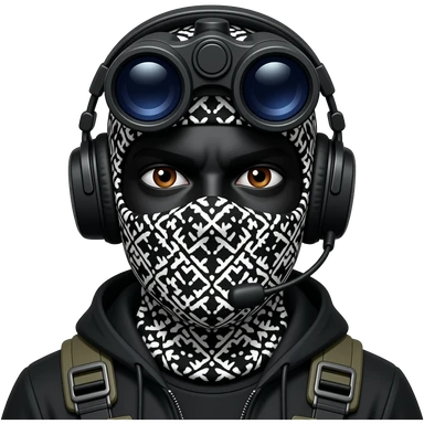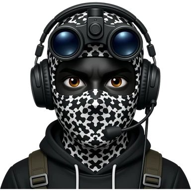 man with brown eyes wearing black clothes, face total painted black and a black and white patterned balaclava and wears a headset and a big black night vision device on his headtop emoji