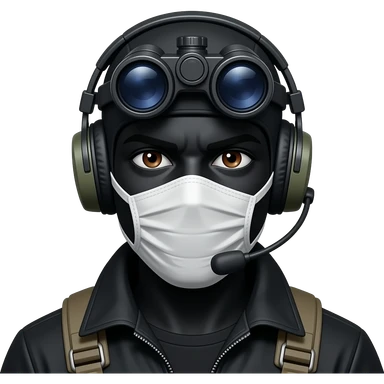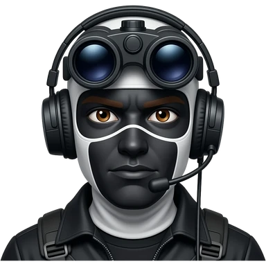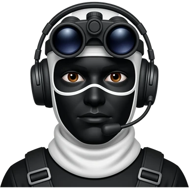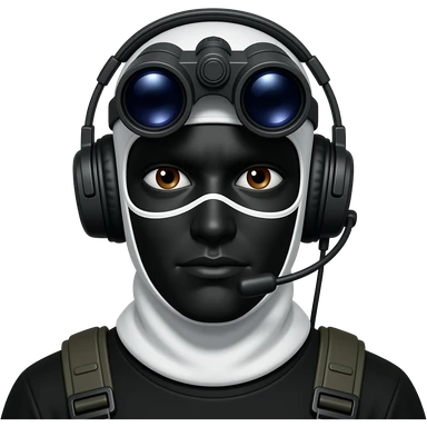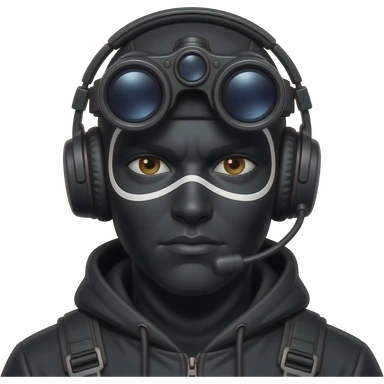 man with brown eyes wearing black clothes, face total painted black and a whiteblack balaclava and wears a headset and a big black night vision device on his headtop emoji