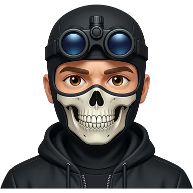 man with brown eyes wearing black clothes with a skullface balaclava and a black night vision device on his headtop emoji