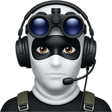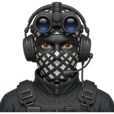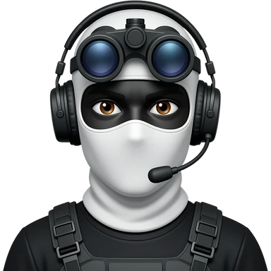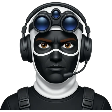 man with brown eyes wearing black clothes, face total painted black and a blackwhite balaclava and wears a headset and a big black night vision device on his headtop emoji