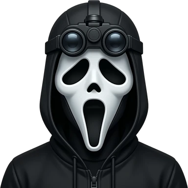 man with brown eyes wearing black clothes with a ghostface balaclava and a black night vision device on his headtop emoji