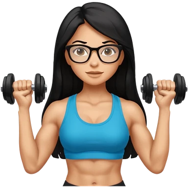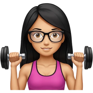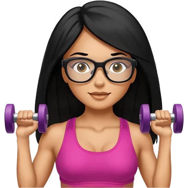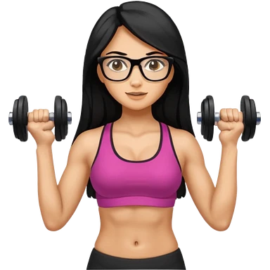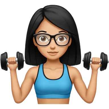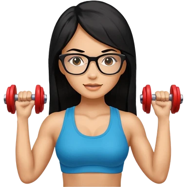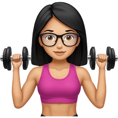 Mujer fitness usando mancuernas con lentes de marco delgado y cabello largo negro emoji
