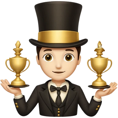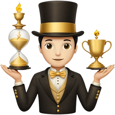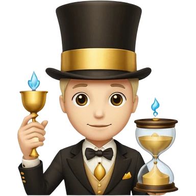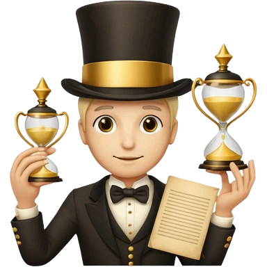 many hands in one, a top hat with a gold stripe, a golden hourglass, papers, a cup emoji