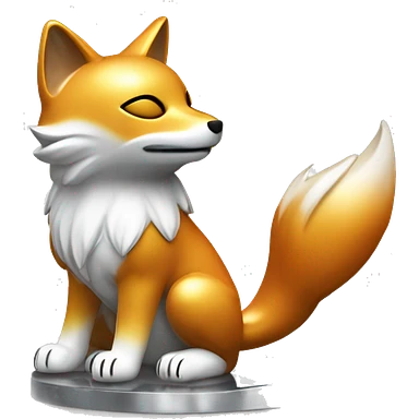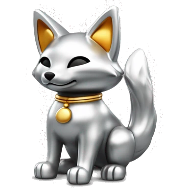 Fully chromed Maneki Neko-style fox statue in iOS emoji style, with smooth, rounded edges, reflective surface with soft light reflections. Minimalist features like the tail, raised paw, and coin. Plain white background to emphasize the chrome texture. emoji