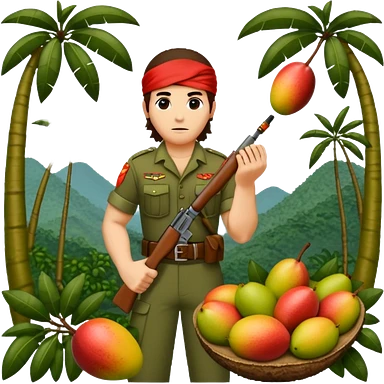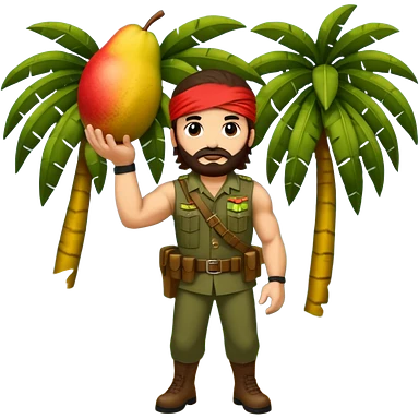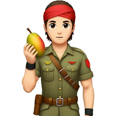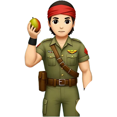 quiero que crees la imange de un Mango con Brazos fuertes y piernas como las de un culturista, que lleve uniforme militar de selva y que tenga pelo largo y una bandana roja en la cabeza como la de rambo y tambien que este en posicion de ataque con una ametralladora pixelart emoji