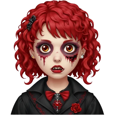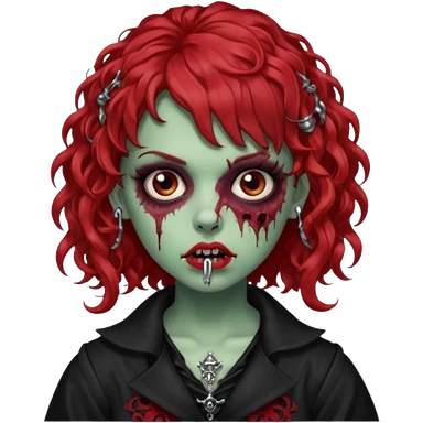 zombie girl red hair cacheado médio e franja, com piercings na boca, nariz e sobrancelha, roupa gótica emoji
