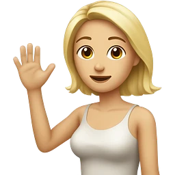 mujer con pelo pelirrojo, ondulado largo y hasta el pecho, con ojos marrones verdosos y muy sonriente con una mano levantada emoji