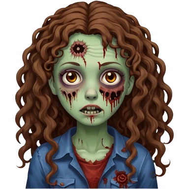 Foto de uma menina com cabelo cacheado longo castanhos, olhos castanhos no estilo zumbi emoji