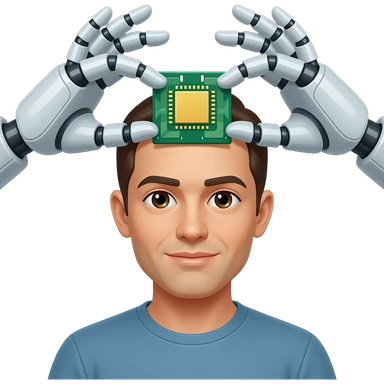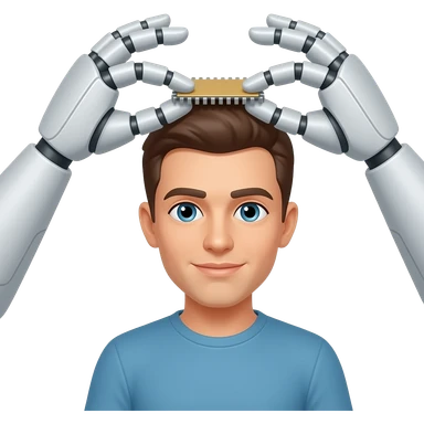 Manos de un robot poniendo un chip en la cabeza de un humano atrás emoji