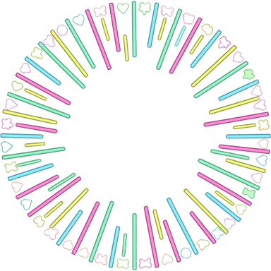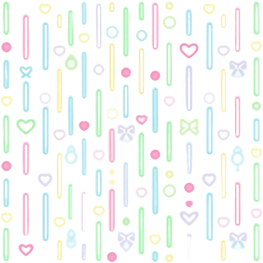 many light blue , pink, green and yellow colored glowly straight, vertical, and horizontal lines, small outlined hearts, bows and circles of the same colour scattered messily and without a pattern far from each other while looking like they might form a circle emoji