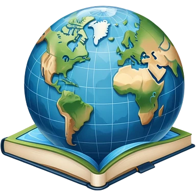 an icon featuring an earth with atitude and longitude lines, a textbook, and a topographic map, symbolizing geography as a science. The design includes a compass, mountain ranges, and rivers, representing the study of Earth's features and landscapes. Transparent background highlights geography. emoji