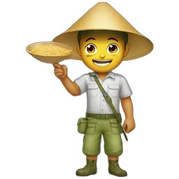 A memoji-style Vietnam man with yellow skin sitting at a desk. He has black hair and is wearing a traditional Vietnamese conical hat and a black shirt. In front of him is a laptop like macbook with a logo styled as '</>' on the back emoji