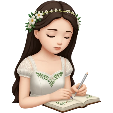 Maret – Cewe Overthinker/SENSITIF Kulit putih pucat lembut, rambut hitam panjang lurus agak messy, belah tengah. Pakai sweater lavender terang oversized. Duduk, pegang jurnal & pulpen, tatapan kosong mikir. emoji
