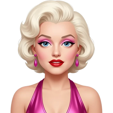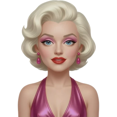 Marilyn Monroe with blue eyes, white-blonde hair, pink eyeshadow, red lipstick, hot pink metallic halter dress, earrings emoji