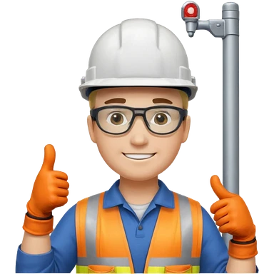 Tecnico electricista, con chaleco azul y gorra, gafas de trabajo, hombre, saludando con una mano dedo pulgar arriba, mirando de medio lado, feliz emoji