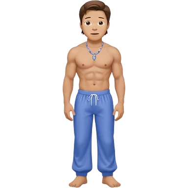 Mark Wahlberg with brown hair, latex periwinkle baggy pants, shirtless with necklace emoji