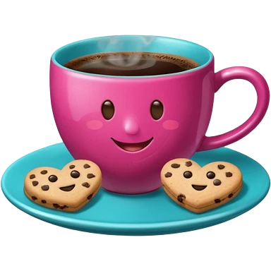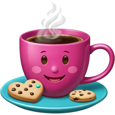 cup of coffee, steaming, the smoke should come out in the shape of a heart, the color of the cup is fuchsia, the cup has a happy face printed on it, the cup rests on a turquoise blue plate, and there are cookies and sugar cubes around the cup. emoji