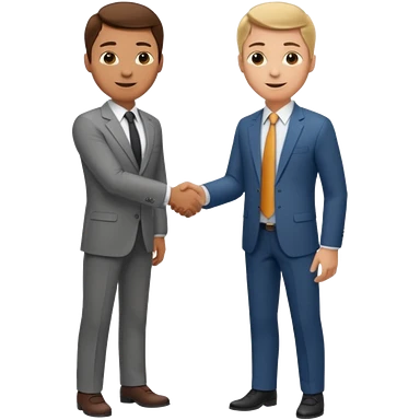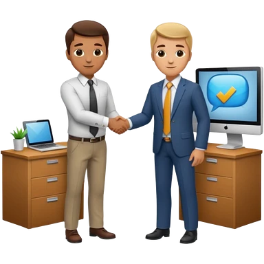 a video editor handshaking with a castomer. customer wears suit and tie but video editor wears shirt and trouser. they are handshaking inside a corporate office. emoji