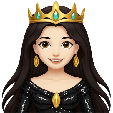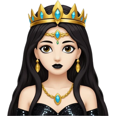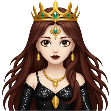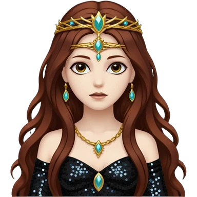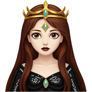 Persephone, Goddess of Death from Gods and Goddesses with long dark auburn hair, black sequin outfit emoji