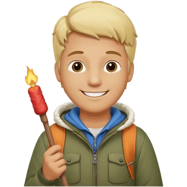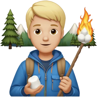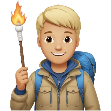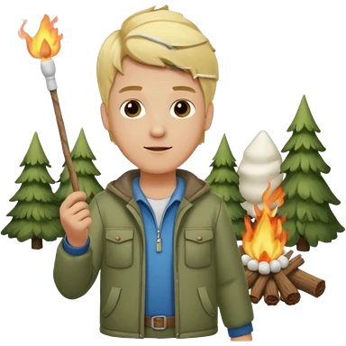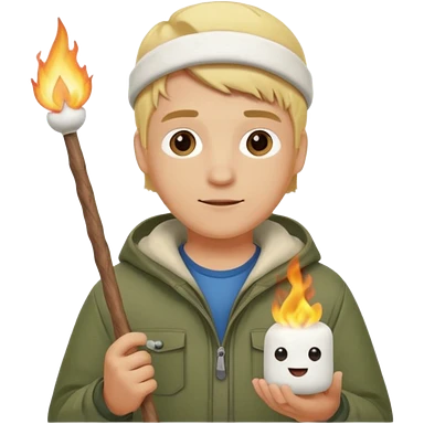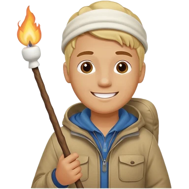 bşonde male with camping clothes holding marshmallow stick emoji