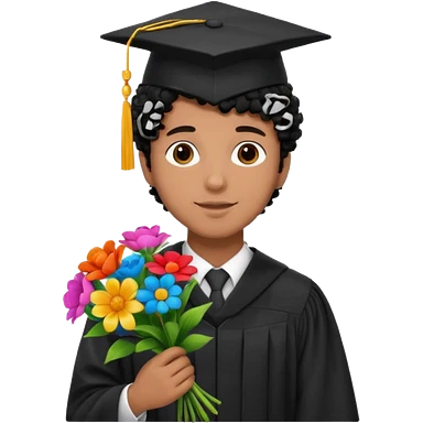 Graduated Students, Male, brown skin, black curly hair, wearing graduation cap, holding bouquet of flowers emoji