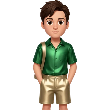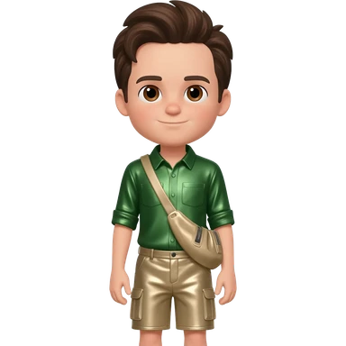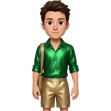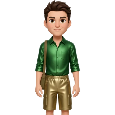 Chris Kratt with brown eyes, dark brown hair, green metallic shirt, beige metallic baggy shorts emoji