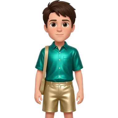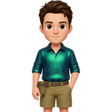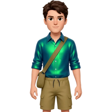 Chris Kratt with brown eyes, dark brown hair, green blue metallic shirt, beige metallic baggy shorts emoji