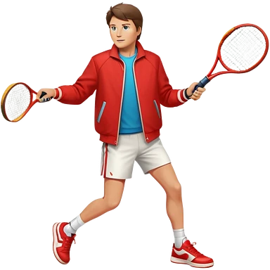 Marty McFly playing tennis, wearing his iconic red jacket and futuristic sneakers, holding a tennis racket, dynamic pose, retro-futuristic style, vibrant colors, simple and clean design, emoji-style illustration. emoji