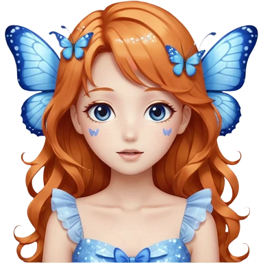 gorgeous shiny blushing pastel core glittery sparkly anime lady with butterflies and beautiful ginger hair fairycore high quality detailed vogue trending aesthetic, blonde hair, blue and white dress emoji