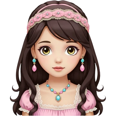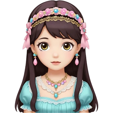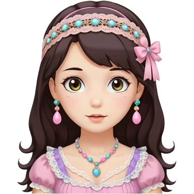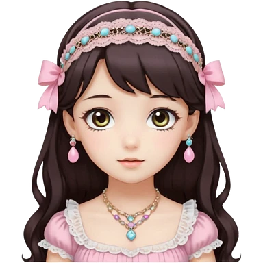 Gorgeous spectacular epic realistic mature anime-styled smooth soft shiny romantic pastel anime style lady with blushing cheeks, with a lace-maiden-headband, long beautiful luscious stylish hair, big pretty eyes, dark-brown hair, colorful pastel Lolita dress, necklaces, jewels emoji