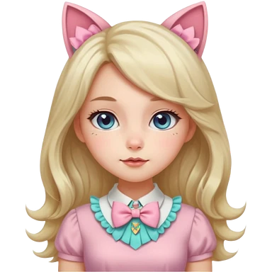 Gorgeous pastel anime style lady with blushing cheeks, cat ears, long beautiful luscious stylish hair, big pretty eyes, cute colorful pastel dress and skirt and bow ties, and necklace emoji