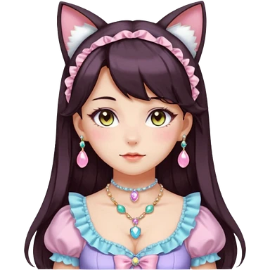 Gorgeous spectacular epic realistic mature anime-styled smooth soft shiny romantic pastel anime style lady with blushing cheeks, cat ears, long beautiful luscious stylish hair, big pretty eyes, dark-brown hair, colorful pastel Lolita dress, necklaces, jewels emoji