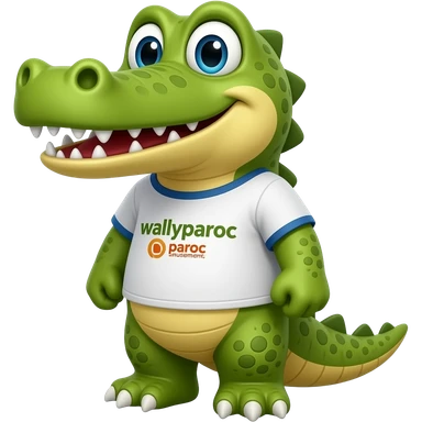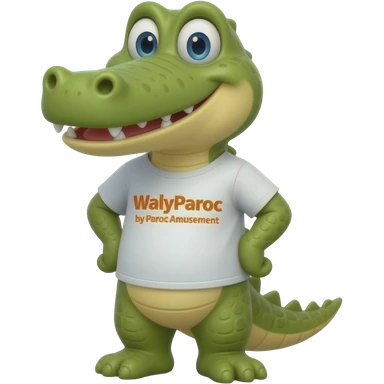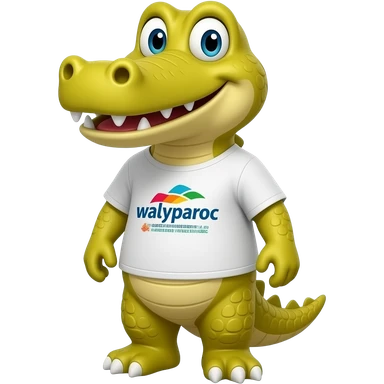 Un mascotte crocodile jaune pour le parc walyparoc avec un t-shirt marquer walyparoc by paroc amusement ! emoji