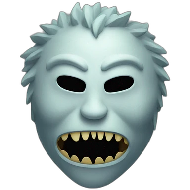 Rick Astley wearing a demon monster mask ( that probably originated from a tv show) that has small but sharp teeth and no eyes and the image is sideways and the entire image including Rick is gray emoji