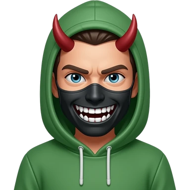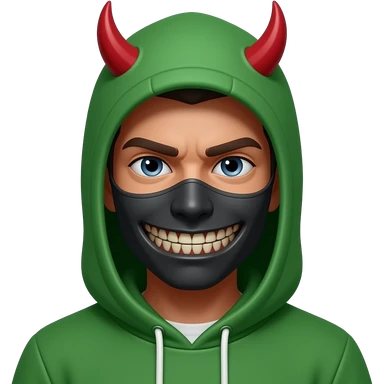 Green hoody and irony mask on face looks like devil's some realistic more realistic emoji