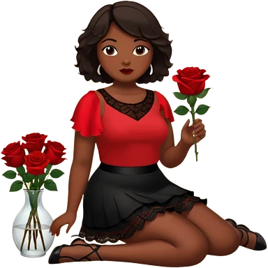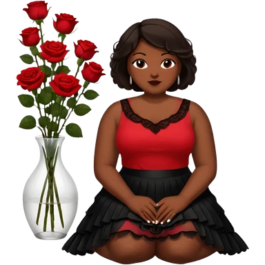 A plus-size black woman with short, straight, dark brown hair is wearing a red sleeveless shirt and a black lace ruffled skirt. She is holding a rose and sitting on the floor with her legs crossed. On the floor is a glass vase with red roses. emoji