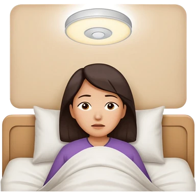 A middle-aged Asian woman lying in bed, unable to sleep emoji