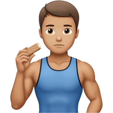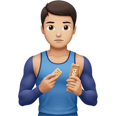 A male athlete holding a protein bar and frowning deeply emoji