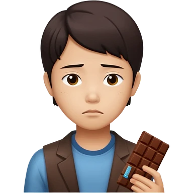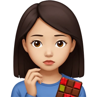A young Asian female with a gloomy expression, thinking of chocolate emoji