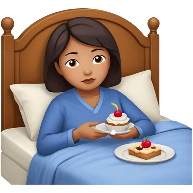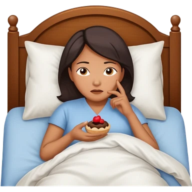 A middle-aged Asian woman lying in bed, unable to sleep thinking of dessert emoji