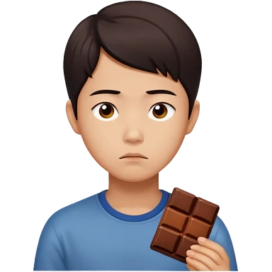 A young Asian dieter with a gloomy expression, thinking of chocolate emoji