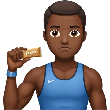 A male athlete holding a protein bar and frowning emoji