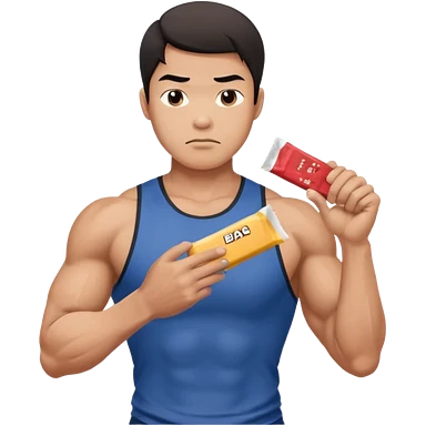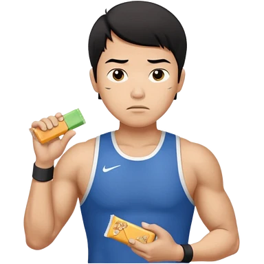 A asian male athlete holding a protein bar and frowning deeply emoji