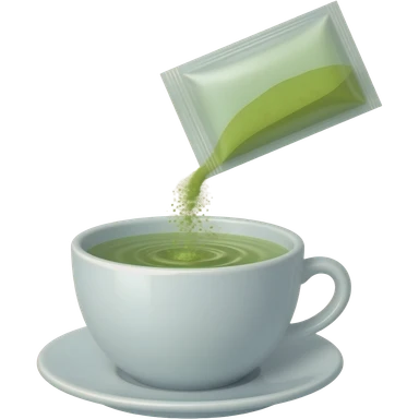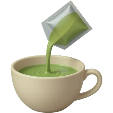 Minimal emoji-style illustration of matcha powder being poured into a cup with water. Fine green matcha powder falling from a sachet or spoon into the liquid, visible mixing moment. Clean, simple shapes, soft green tones, light beige (off-white) cup, centered composition, minimal background. emoji