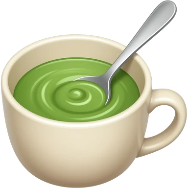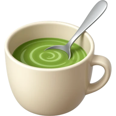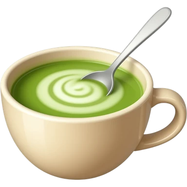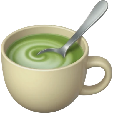 Emoji-style illustration of matcha being stirred in a cup, light beige cup with green matcha and soft foam, spoon creating a swirl, minimal, clean, soft colors. emoji