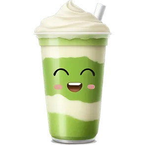 a plastic glass of matcha latte with whipped cream and green tea on top emoji