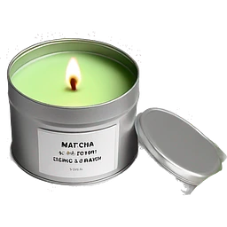 matcha scented candle in a silver tin with a small white label hyperrealistic emoji