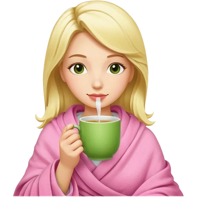Блондинка пьет зелёный чай укутавшись розовым пледом emoji