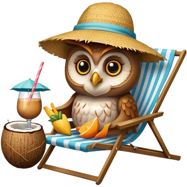 Сова в шезлонге с кокосом, загорает под пальмой, шляпа на голове emoji